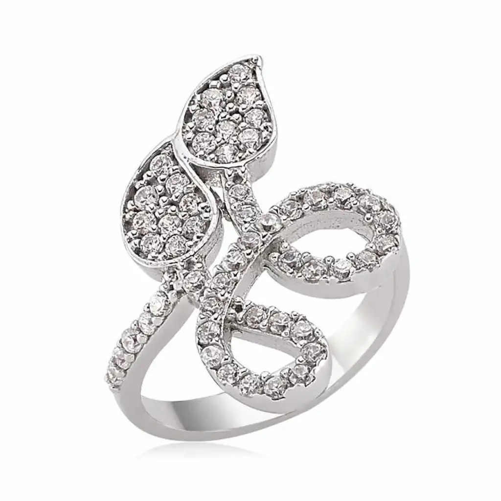 925 ayar gümüşten imal edilen yaprak desenli bayan yüzük üzerinde bulunan beyaz taşlar zirkondur. Gümüş yaprak bayan yüzük üzerine rodyum kaplama yapılmıştır. Rodyum kaplama yapılan gümüş bayan yüzük modelleri parlaklığını uzun süre muhafaza eder, oksitlenmesi gecikir. Bayan yüzük modellerimizin tamamında olduğu gibi gümüş yaprak bayan yüzük modeli de el emeği ile üretilmiştir. Gümüş ve değerli taşlar nedeniyle belirtilen ortalama ürün ağırlığında ± %10 sapma olabilmektedir.