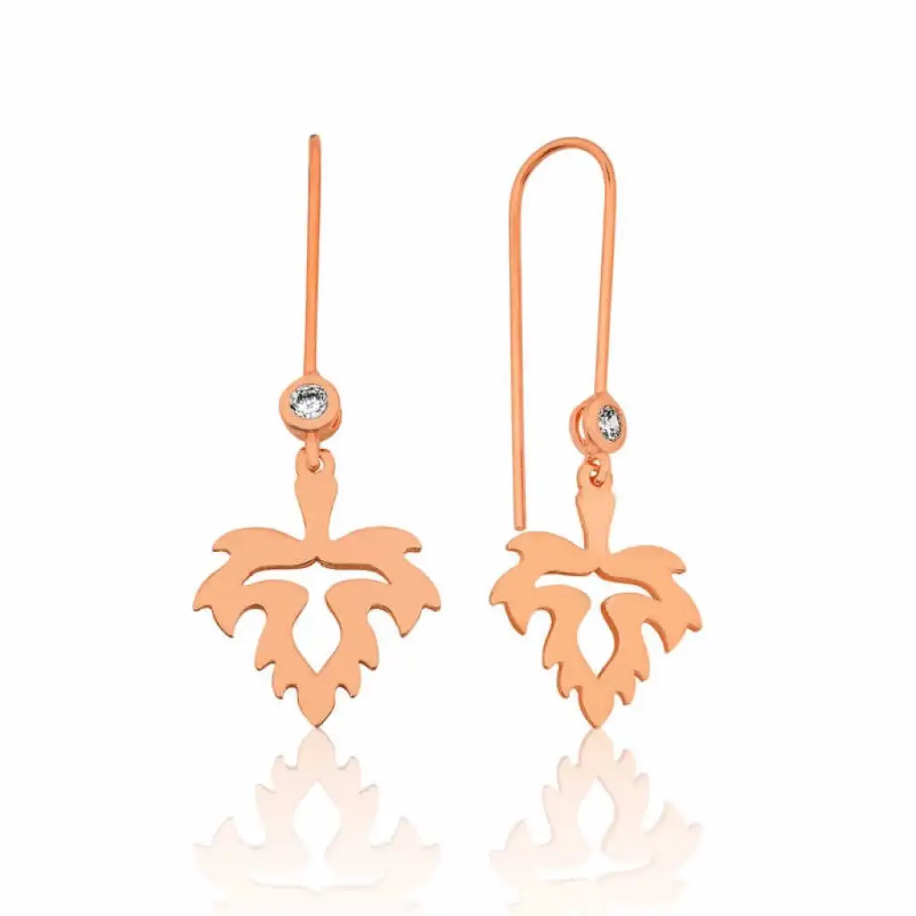 Yaprak deseni tabiattan almakta olduğu kuvveti, saygıyı ve zarafeti simgeler. ''Güçlüyüm ve yeniden doğmayı bilirim'' imajı çizmektedir ve evrene olan saygıyı belirtmektedir. Çiçekler ve bununla birlikte yapraklar, insanoğluna tabiatın verdiği en güzel hediyelerdendir. Doğanın verdiği bu bereketli hediyeyi sevdiklerinizle paylaşmaya ne dersiniz... Gümüş yaprak sallantılı küpe modeli sevdiklerinizin teninde hayat bulsun. Sallantılı yaprak küpe modeli 925 ayar gümüşten imal edilmiştir. Gümüş üzerine rose altın kaplama yapılmıştır. Rose altın kaplama yapılan gümüş küpe modelleri parlaklığını uzun süre muhafaza eder, gümüş rengini pembe renge dönüştürür ve oksitlenmeyi geciktirir. Diğer gümüş küpelerde olduğu gibi gümüş yaprak sallantılı küpe modeli de tamamen el emeği ile üretilmiştir. Gümüş ve değerli taşlar nedeniyle belirtilen ortalama ürün ağırlığında ± %10 sapma olabilmektedir.