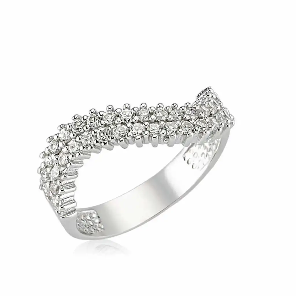 Kendine özen gösteren ve şık olmayı benimsemiş zarif bayanların tercihi genelde gümüş takı modelleridir. Bunlar arasında vazgeçilmez aksesuar gruplarından biri kuşkusuz gümüş yüzüklerdir. Bu yarım tur bayan yüzük 925 ayar gümüşten imal edilmiştir. Gümüş üzerine rodyum kaplama yapılmıştır. Rodyum kaplama yapılan gümüş bayan yüzük modelleri parlaklığını uzun süre muhafaza eder ve oksitlenmesi gecikir. Yüzük üzerinde bulunan beyaz taşlar zirkondur. Tüm bayan yüzük modellerinde olduğu gibi gümüş yarım tur bayan yüzük modeli de el emeği ile üretilmiştir. Gümüş ve değerli taşlar nedeniyle belirtilen ortalama ürün ağırlığında ± %10 sapma olabilmektedir.