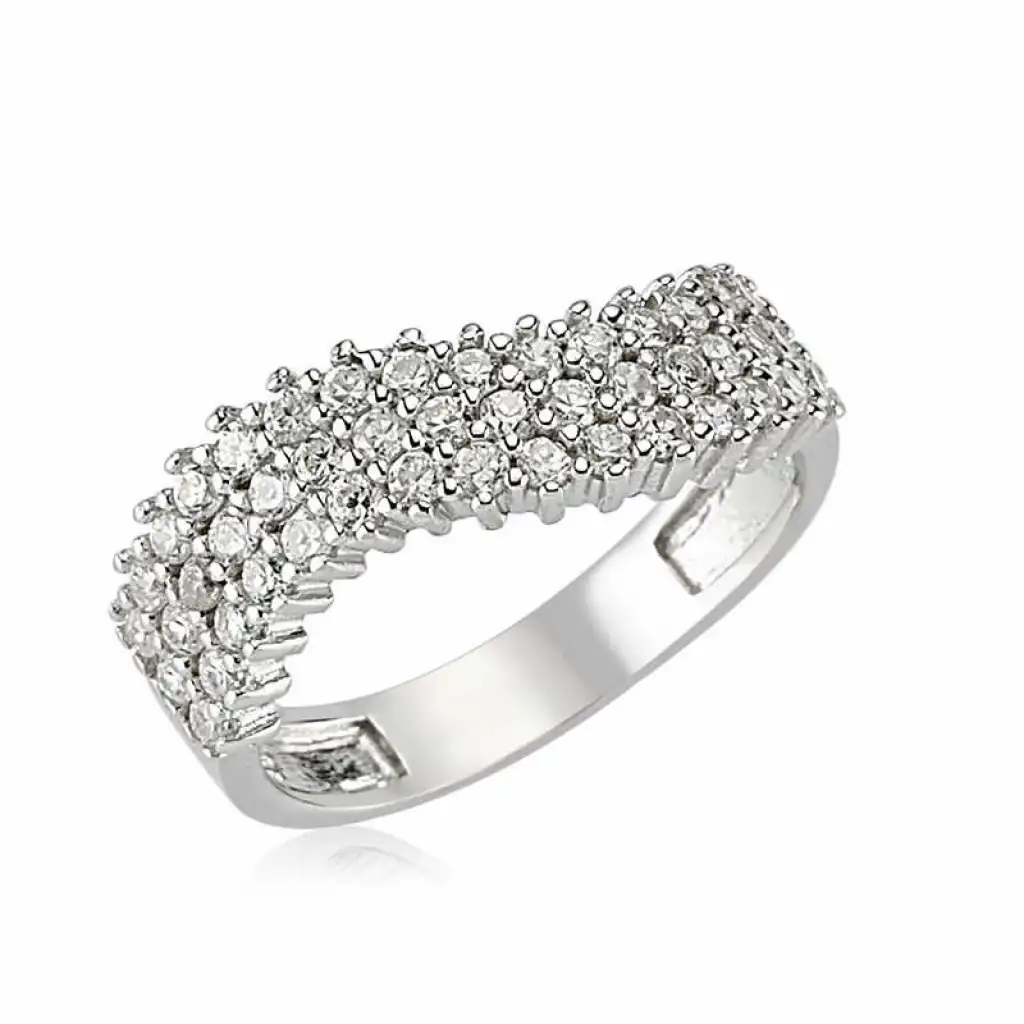 Kendine özen gösteren ve şık olmayı benimsemiş zarif bayanların tercihi genelde gümüş takı modelleridir. Bunlar arasında vazgeçilmez aksesuar gruplarından biri kuşkusuz gümüş yüzüklerdir. Bu yarım tur bayan yüzük 925 ayar gümüşten imal edilmiştir. Gümüş üzerine rodyum kaplama yapılmıştır. Rodyum kaplama yapılan gümüş bayan yüzük modelleri parlaklığını uzun süre muhafaza eder ve oksitlenmesi gecikir. Yüzük üzerinde bulunan beyaz taşlar zirkondur. Tüm bayan yüzük modellerinde olduğu gibi gümüş yarım tur bayan yüzük modeli de el emeği ile üretilmiştir. Gümüş ve değerli taşlar nedeniyle belirtilen ürün ağırlığında ± %10 sapma olabilmektedir.