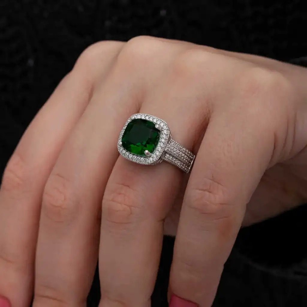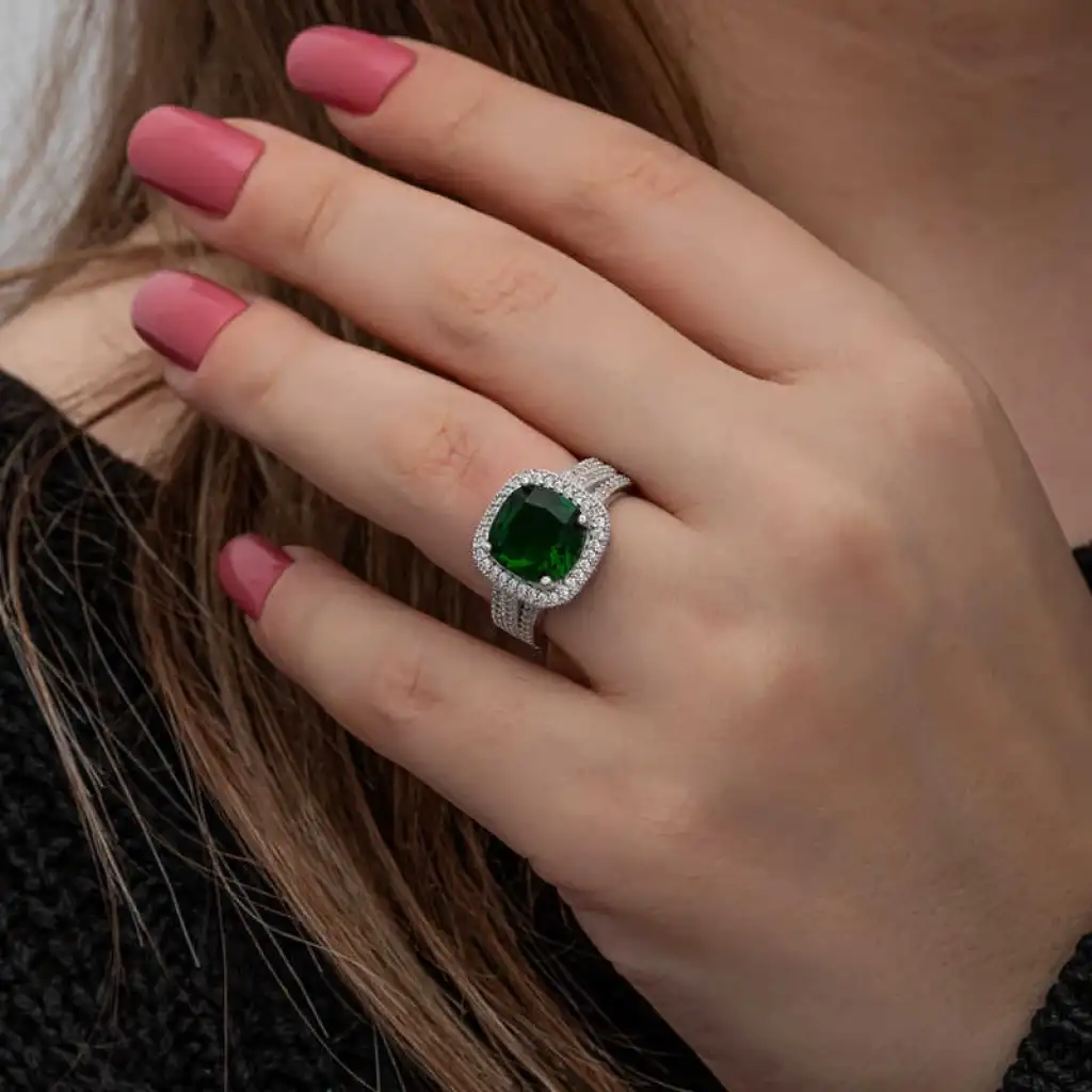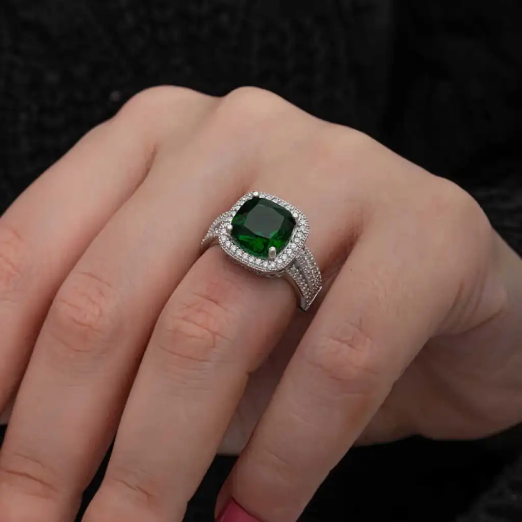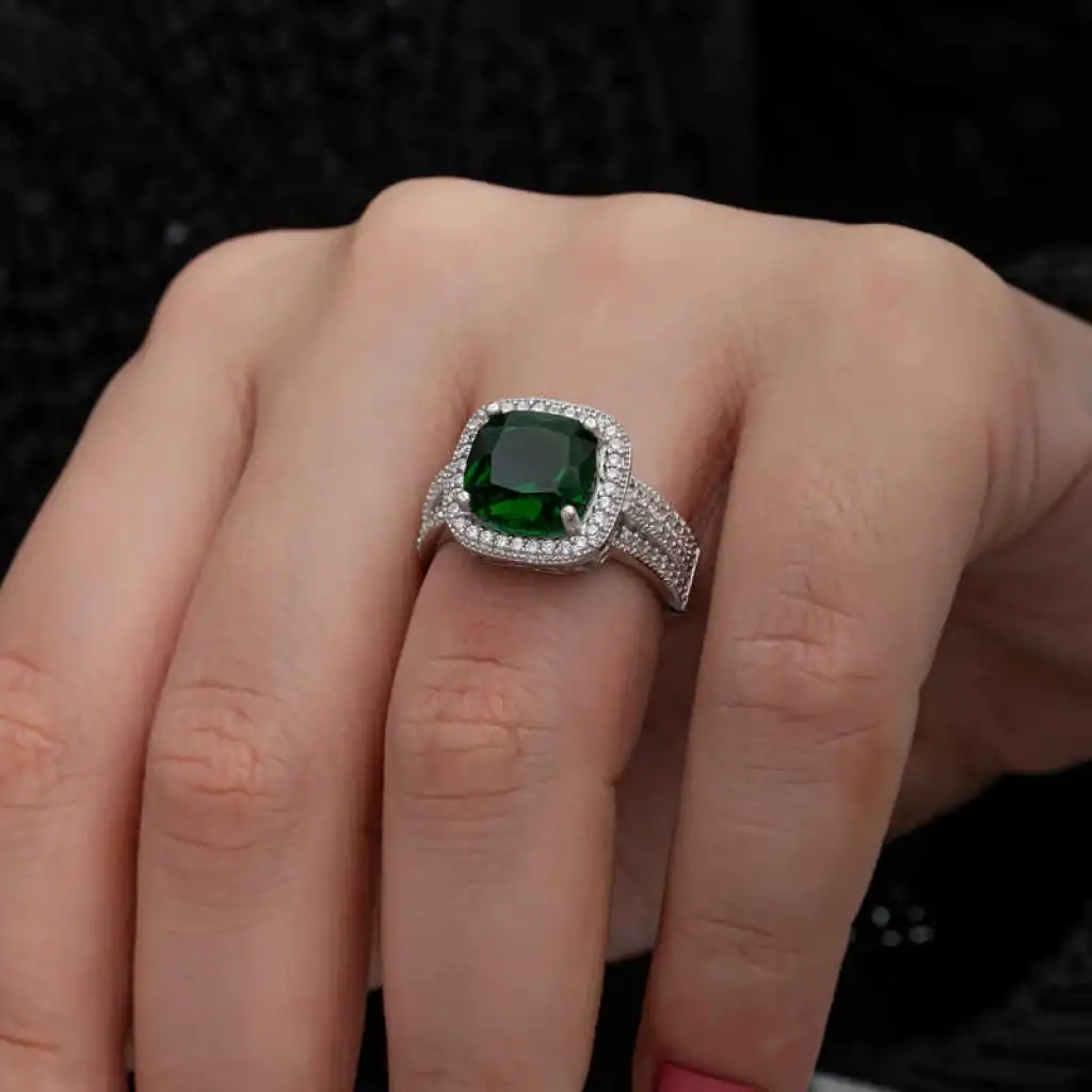 Gümüş Yeşil Baget Kare Kadın Yüzük