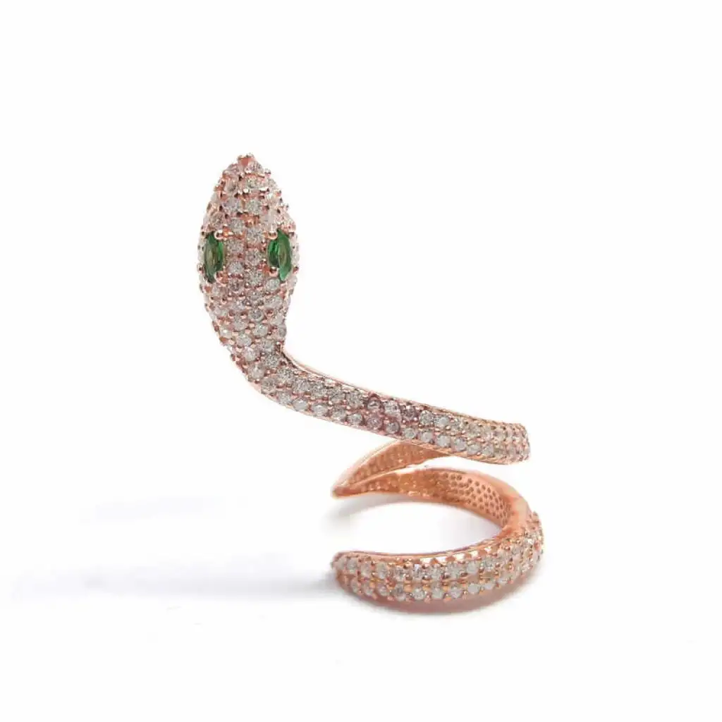 Doğadan ilham alınarak tasarlanan aksesuarlar ihtişamınıza ihtişam katabilir; hikayesi olan küpeler sizin kişisel hikayenize de ortak olabilir. İşte bunlar için tek yapmanız gereken küpe kategorimize yakından bakmak. Bu şık tek kulağa takılarak kullanılan yılan modeli küpe; doğum günü, sevgililer günü veya özel günlerde tercih edebilecek çok şık bir hediye seçeneğidir. Üzeri zirkon taşlarla kaplanmış ışıl ışıl bu küpe severek kullanabileceğiz bir modeldir. Bu şık küpe 925 ayar gümüşten imal edilmiştir. Gümüş üzerine rose kaplama yapılmıştır. Rose kaplama yapılan gümüş küpeler parlaklığını uzun süre muhafaza eder, oksitlenmesi gecikir. Üzerinde bulunan taşlar zirkondur. Tüm bayan gümüş ürünlerde olduğu gibi gümüş yeşil gözlü tek kıkırdak yılan küpe modeli de el emeği ile üretilmiştir. Gümüş ve değerli taşlar nedeniyle belirtilen ortalama ürün ağırlığında ± %10 sapma olabilmektedir.