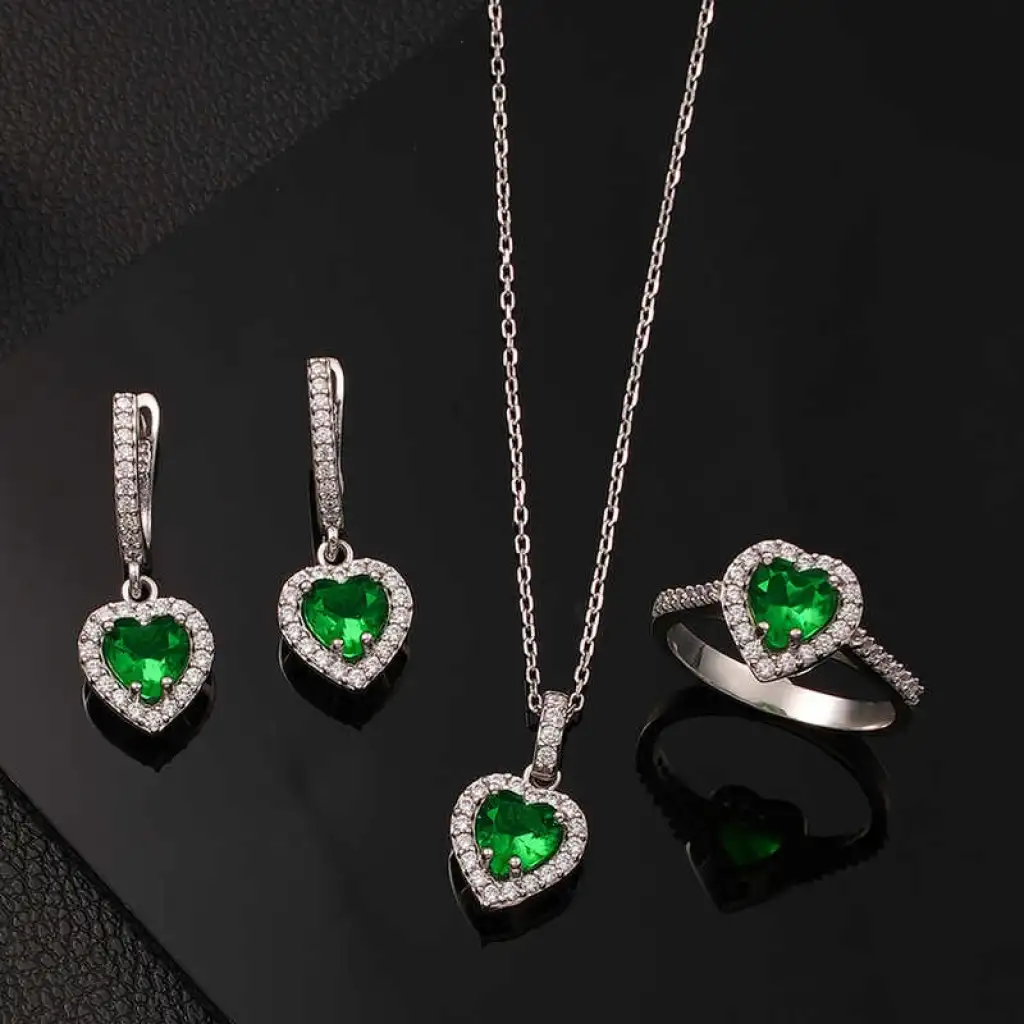 Kalp deseniyle aşkı ifade eden kalpli set modeli ile sevginiz, sevdiğiniz kadının teninde hayat bulsun. Genç sevgililerin ve kendini genç hissedenlerin özel günlerde seçebileceği bu kalpli kadın set ile sevdiğinizi aşkla süsleyin. Sizin olduğu kadar sevdiklerinizin de keyifle takacağı kalp desenli set sevdiğinize en güzel hediyelerden biri olacaktır. Kalpli kadın set 925 ayar gümüşten imal edilmiştir. Gümüş üzerine rodyum kaplama yapılmıştır. Rodyum kaplama yapılan gümüş kadın kalpli setler parlaklığını uzun süre muhafaza eder ve oksitlenmesi gecikir. Set üzerinde bulunan beyaz taşlar zirkondur. Tüm setlerde olduğu gibi gümüş yeşil taşlı kalpli kadın set de el emeği ile üretilmiştir. Gümüş ve değerli taşlar nedeniyle belirtilen ortalama ürün ağırlığında ± %10 sapma olabilmektedir.