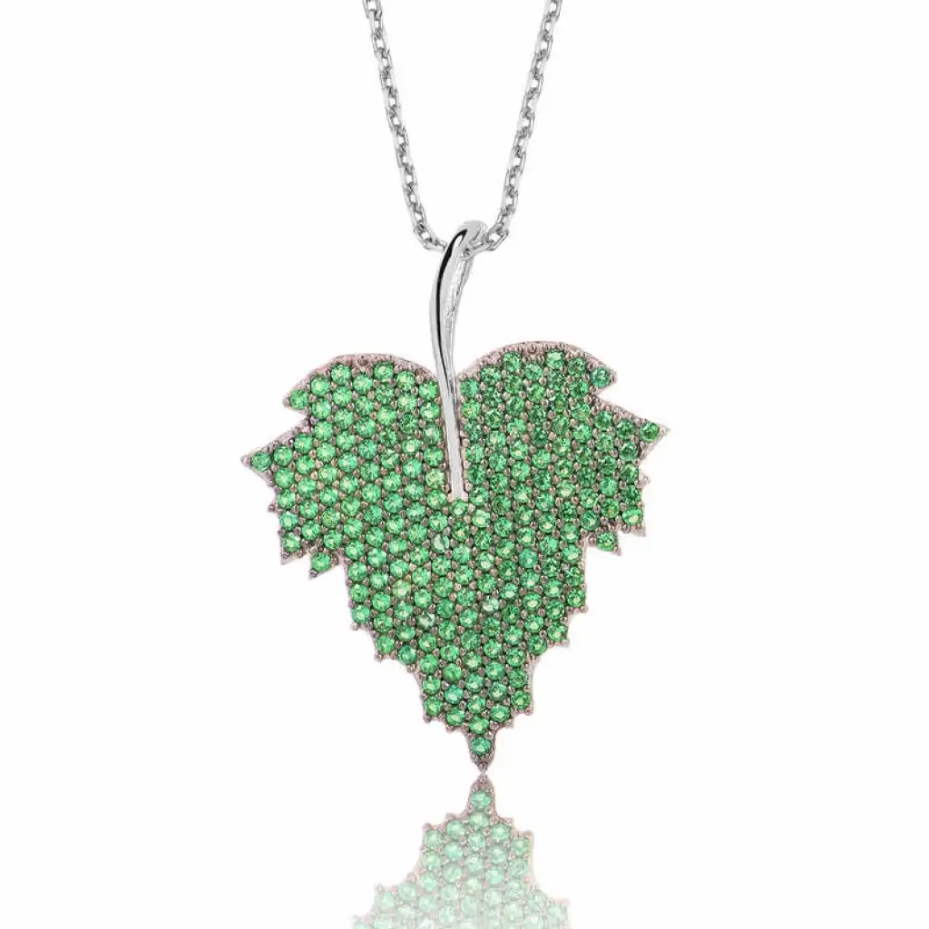 Yaprak deseni tabiattan almakta olduğu kuvveti, saygıyı ve zarafeti simgeler. ''Güçlüyüm ve yeniden doğmayı bilirim'' imajı çizmektedir ve evrene olan saygıyı belirtmektedir. Çiçekler ve bununla birlikte yapraklar, insanoğluna tabiatın verdiği en güzel hediyelerdendir. Doğanın verdiği bu bereketli hediyeyi sevdiklerinizle paylaşmaya ne dersiniz? Gümüş yeşil yaprak bayan kolye sevdiklerinizin teninde hayat bulsun. Yaprak bayan küpe; 925 ayar gümüşten imal edilmiştir. Gümüş üzerine rodyum kaplama yapılmıştır. Rodyum kaplama yapılan ürünler parlaklığını uzun süre muhafaza eder ve oksitlenmeyi geciktirir. Diğer gümüş kolyelerde olduğu gibi gümüş yeşil yaprak bayan kolye de tamamı el emeği ile üretilmiştir. Üzerinde bulunan taşlar zirkondur. Gümüş ve değerli taşlar nedeniyle belirtilen ortalama ürün ağırlığında ± %10 sapma olabilmektedir.