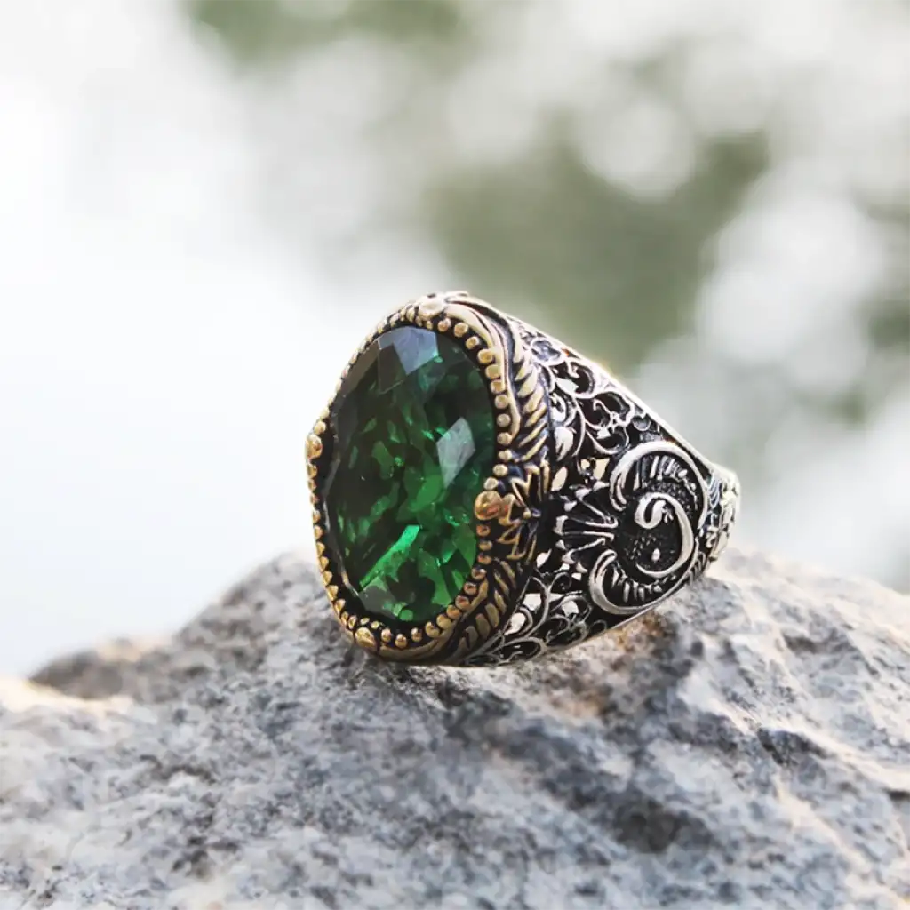 Gümüş Yeşil Zirkon Taşlı Erkek Yüzük