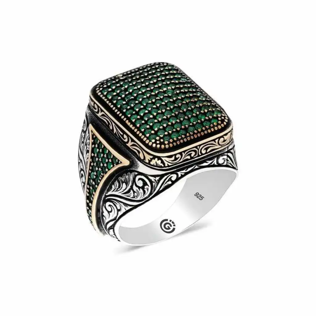 Gümüş Yeşil Zirkon Taşlı Kare Erkek Yüzük