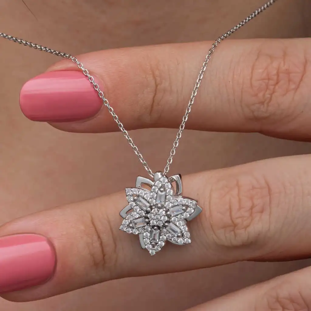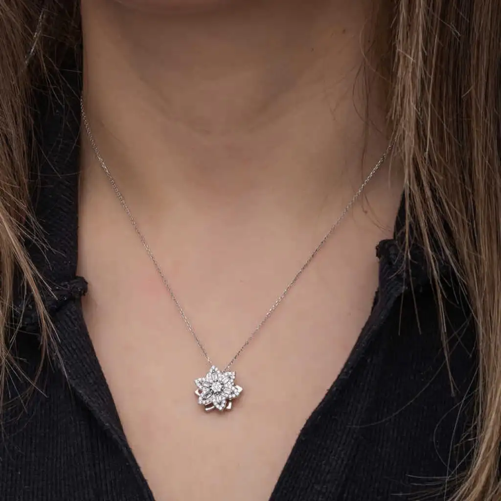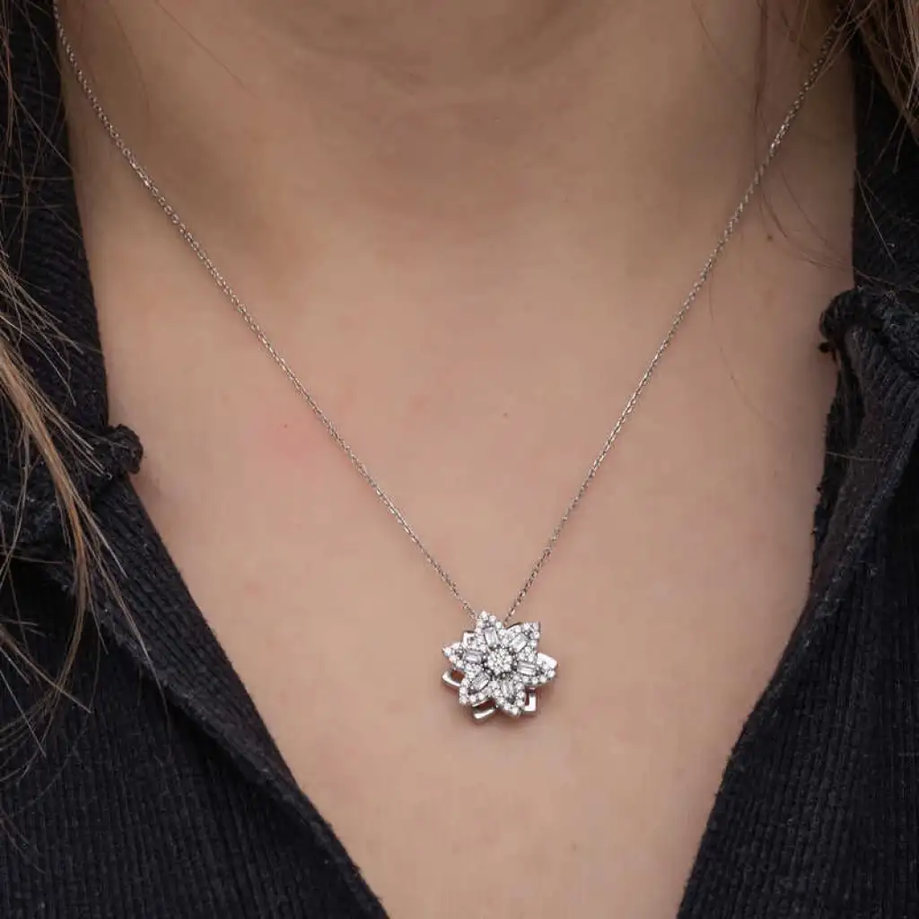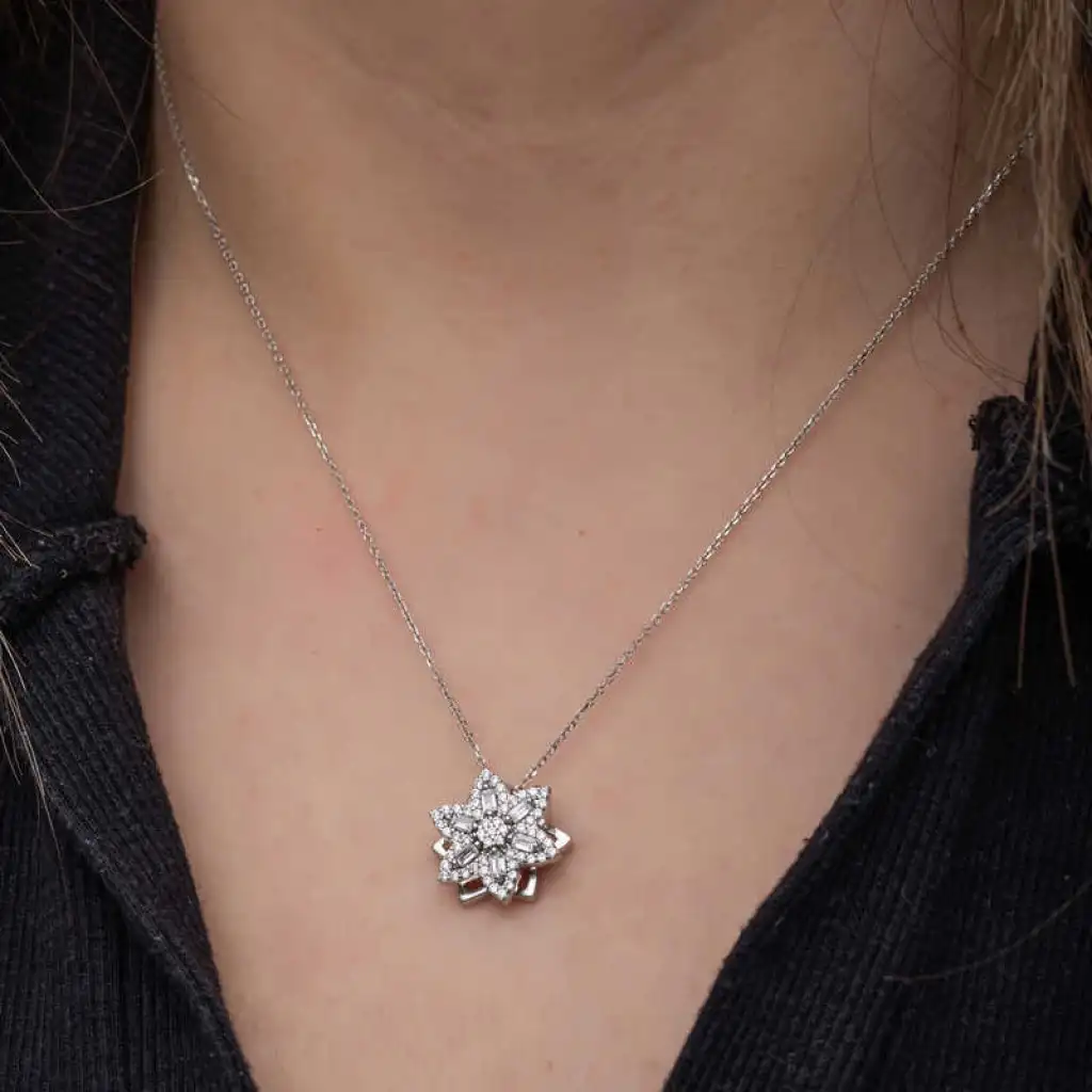 Yıldız, pek çok toplumda ve öğretide şans getirildiğine inanılan uğurlu bir semboldür. Venüs Gezegeninin enerjisini taşır. Venüs Gezegeni, aşk ve aşk enerjisinin de temsilcisidir. Bu şık baget ve zirkon taşlardan oluşan yıldız kolye; doğum günü hediyesi, sevgililer günü hediyesi veya özel günlerde tercih edilebilecek mükemmel bir seçenektir. Gümüş rodyum yıldız baget taşlı dönen stres kadın kolye 925 ayar gümüşten imal edilmiştir. Bu kolye üzerinde rodyum kaplama vardır. Rodyum kaplama yapılan gümüş kadın kolye modelleri parlaklığını uzun süre muhafaza eder. Tüm gümüş kadın kolye modellerimizde olduğu gibi gümüş rodyum yıldız baget taşlı stres dönen kadn kolye modeli de el emeği ile üretilmiştir. Gümüş ve değerli taşlar nedeniyle belirtilen ortalama ürün ağırlığında ± %10 sapma olabilmektedir.