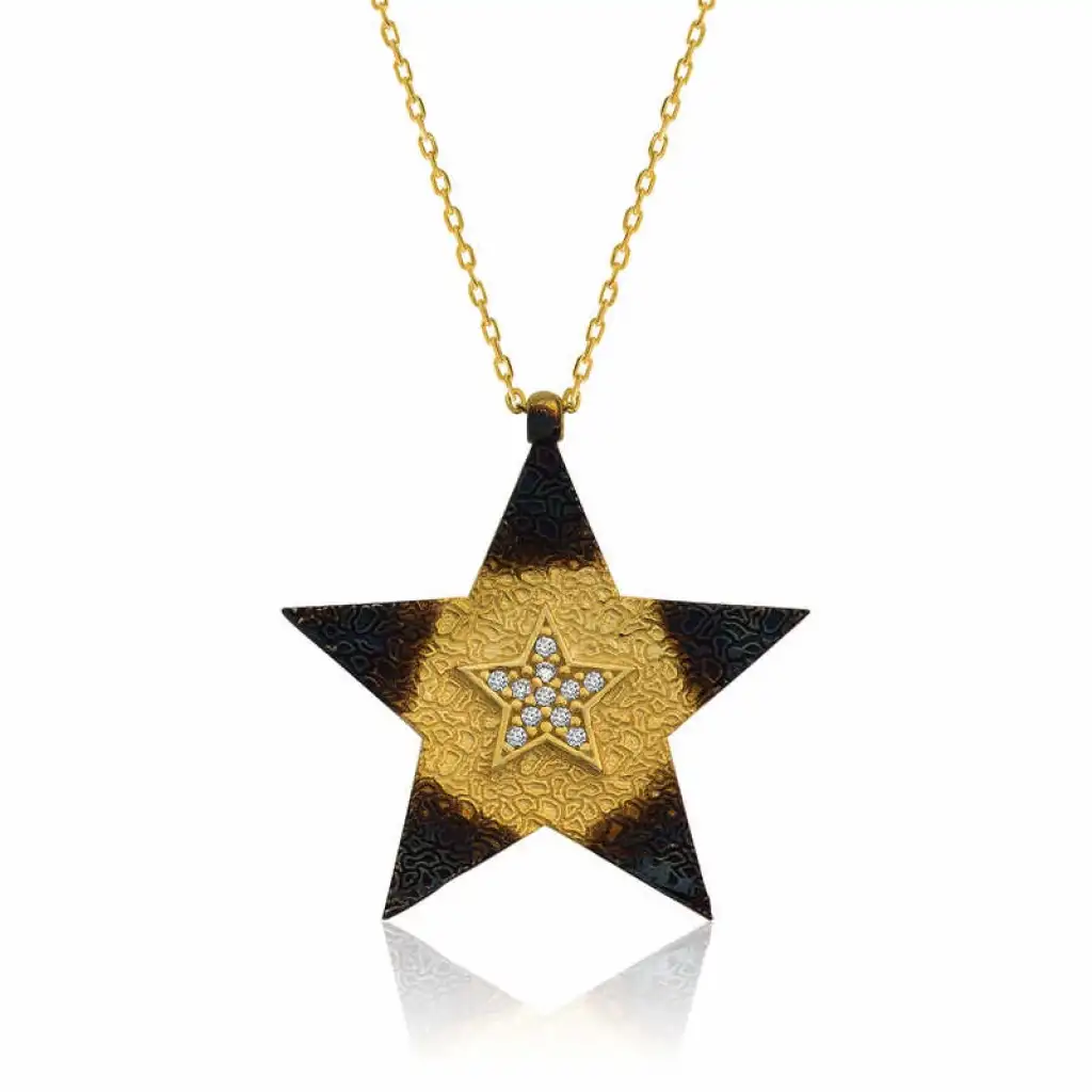 Gecenin parlak ışıltısını anımsatan yıldız, sembolik olarak evrenin sonsuzluğunu, uzaktaki bir noktayı ifade eder. Parıltının, ışığın, aydınlığın ve umudun sembolüdür. Her insan özel, her sevilen eşsizdir. Eşsiz sevginin ömür boyu sürecek birlikteliğin simgesi gümüş yıldız bayan kolye ile sevdiklerinizi mutlu etmeye ne dersiniz? Gümüş üzerine altın kaplama yapılmıştır. Altın kaplama yapılan ürünler parlaklığını uzun süre muhafaza eder, gümüş rengini sarı renge dönüştürür ve oksitlenmeyi geciktirir. Gümüş bayan kolye modellerinin tamamında olduğu gibi gümüş yıldız bayan kolye de modeli de el emeği ile üretilmiştir. Gümüş ve değerli taşlar nedeniyle belirtilen ortalama ürün ağırlığında ± %10 sapma olabilmektedir.