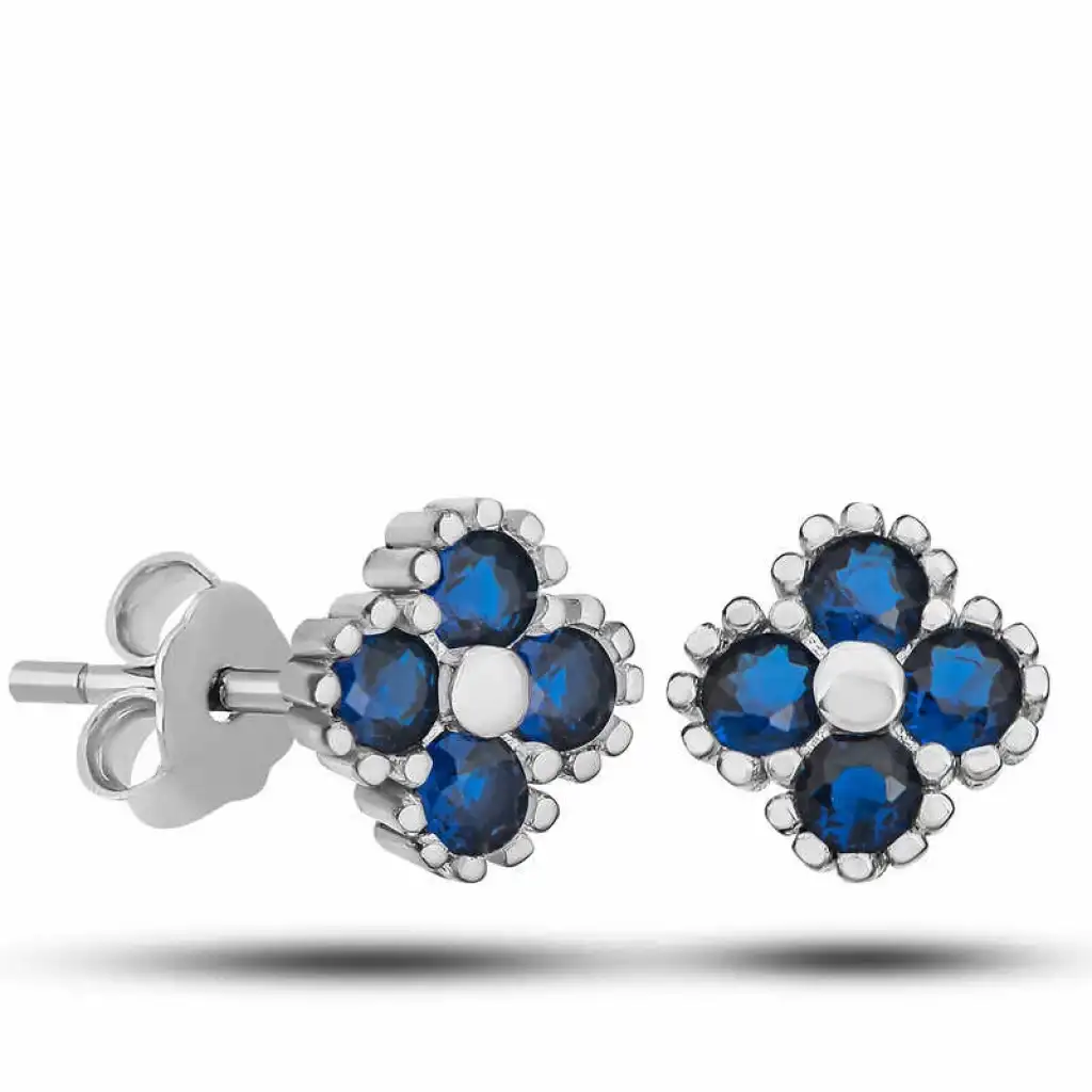 Gümüş Yonca Çivili Mavi Taşlı Çocuk Küpe