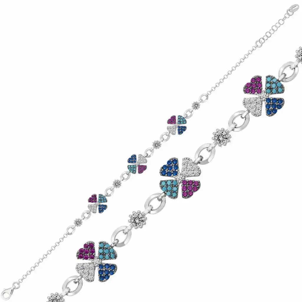 Dört yapraklı yonca bütün kültürlerde iyi şansın sembolü olarak kabul edilir. Yoncanın dört yaprağının da ayrı birer anlamı vardır. Birinci yaprak ümidi, ikincisi imanı, üçüncüsü aşkı, dördüncü yaprak ise şansı simgeler. Dört kalbin birleşmesiyle oluşan özel tasarım bayan bileklik modeli 925 ayar gümüşten imal edilmiştir. Bu zarif bileklik genç aşıkların özel günlerde tercih edebileceği çok şık bir seçenek olacaktır. Gümüş kalpli yonca bayan bileklik üzerinde rodyum kaplama vardır. Rodyum kaplama yapılan gümüş bayan bileklikler parlaklığını uzun süre muhafaza eder ve oksitlenmesini geciktirir. Gümüş yonca renkli bayan bileklik sizin olduğu kadar sevdiklerinizin de keyifle takacağı en güzel hediyelerden biri olacaktır. Tüm gümüş bayan bileklik modellerimizde olduğu gibi gümüş yonca bileklik de el emeği ile üretilmiştir. Gümüş ve değerli taşlar nedeniyle belirtilen ürün ağırlığında ± %10 sapma olabilmektedir.