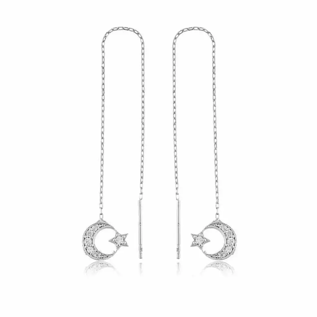 Türk bayrağının ilhamını da kan gölüne yansıyan ay ve yıldızdan aldığını biliyoruz. Bayrağın taşıdığı kutsal anlamı taşımak ve sevdiklerinizle paylaşmak için kaçırılmayacak bir fırsat sunuyoruz. Bu şık küpeyi; doğum günü hediyesi, sevgililer günü hediyesi veya annelere hediye olarak özel günlerde tercih edebileceğiniz çok şık bir seçenektir. Bu zincirli ay yıldız küpe modeli 925 ayar gümüşten imal edilmiştir. Gümüş üzerine rodyum kaplama yapılmıştır. Rodyum kaplama yapılan gümüş küpeler parlaklığını uzun süre muhafaza eder, oksitlenmesi gecikir. Üzerindeki taşlar zirkondur. Tüm bayan gümüş küpelerde olduğu gibi gümüş zincirli ay yıldız bayan küpe modeli de el emeği ile üretilmiştir. Gümüş ve değerli taşlar nedeniyle belirtilen ortalama ürün ağırlığında ± %10 sapma olabilmektedir.
