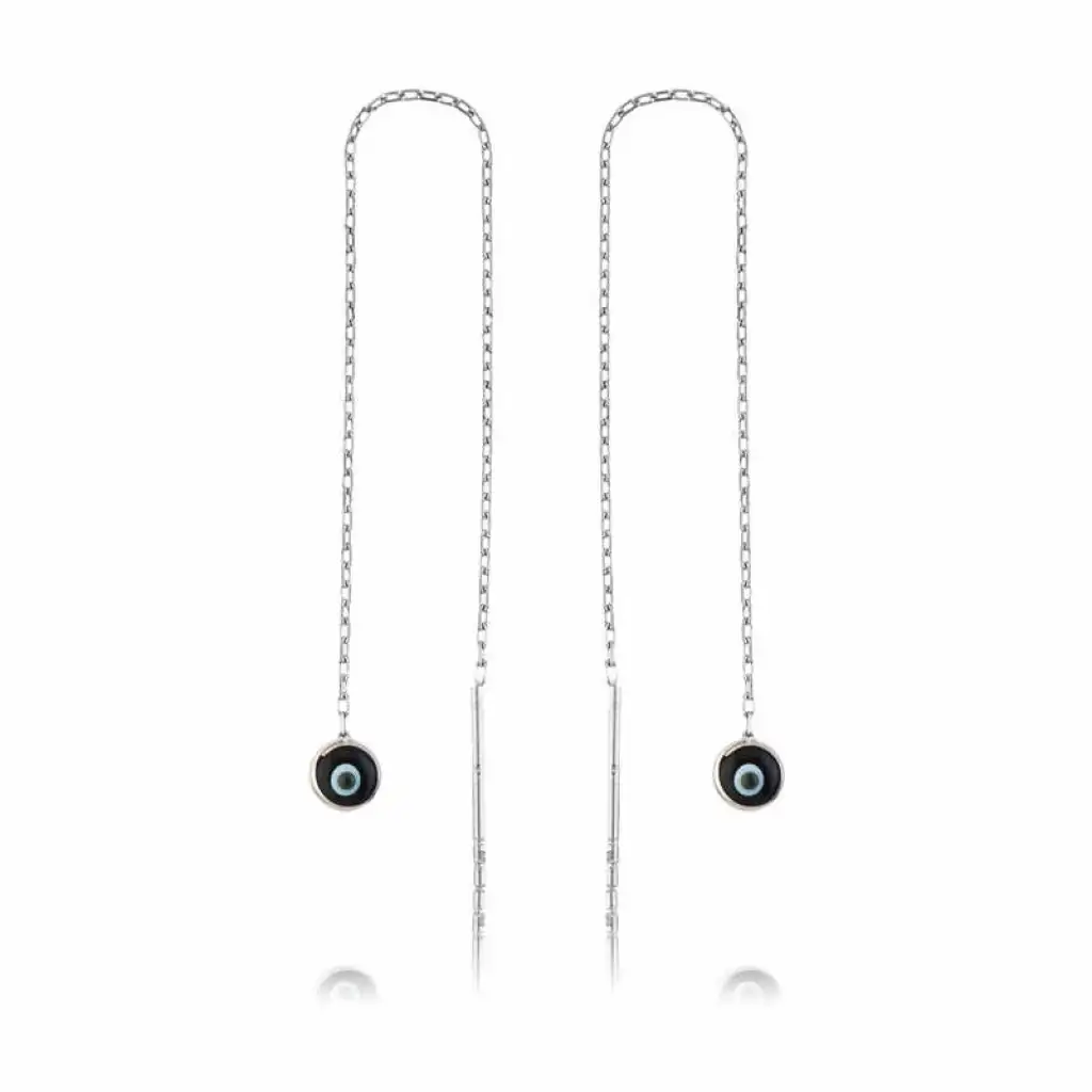 Nazar boncuğunu insanlar uzun yıllardan beri kötü bakıştan korunmak için kullanmışlardır. Kötü bakışların insanlar üzerinde olumsuz etki oluşturmasına karşı bir önlemdir nazar boncuğu… Bu sebeptendir ki insanlar sevdiklerini korumak için nazar boncuğu takmaktadır. Bu nazar küpe de şıklığı ve zarafeti yansıtıyor. Her dönem sevilen ve şıklığından ödün vermeyen bu modeli ; doğum günü hediyesi, sevgililer günü hediyesi veya annelere hediye olarak özel günlerde tercih edebilirsiniz. Zincirli lacivert nazar bayan küpe, 925 ayar gümüşten imal edilmiştir. Gümüş küpe üzerine rodyum kaplama yapılmıştır. Rodyum kaplama yapılan gümüş bayan küpeler parlaklığını uzun süre muhafaza eder, oksitlenmesi gecikir. Üzerinde bulunan taşlar camdır. Tüm gümüş bayan küpelerde olduğu gibi bu gümüş zincirli siyah nazar bayan küpe de tamamı el emeği ile üretilmiştir. Gümüş ve değerli taşlar nedeniyle belirtilen ortalama ürün ağırlığında ± %10 sapma olabilmektedir.