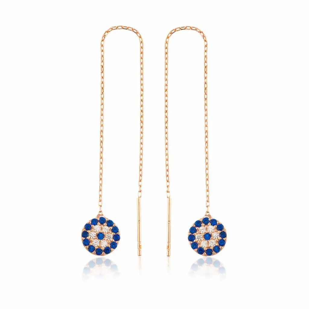 Nazar boncuğunu insanlar uzun yıllardan beri kötü bakıştan korunmak için kullanmışlardır. Kötü bakışların insanlar üzerinde olumsuz etki oluşturmasına karşı bir önlemdir nazar boncuğu… Bu sebeptendir ki insanlar sevdiklerini korumak için nazar boncuğu takmaktadır. Bu nazar küpe de şıklığı ve zarafeti yansıtıyor. Her dönem sevilen ve şıklığından ödün vermeyen bu modeli ; doğum günü hediyesi, sevgililer günü hediyesi veya annelere hediye olarak özel günlerde tercih edebilirsiniz. Gümüş zincirli nazar bayan küpe, 925 ayar gümüşten imal edilmiştir. Gümüş küpe üzerine rose kaplama yapılmıştır. Rose kaplama yapılan gümüş bayan küpeler parlaklığını uzun süre muhafaza eder,gümüşü pembe rengine dönüştürür, oksitlenmesi gecikir. Üzerinde bulunan taşlar zirkondur. Tüm gümüş bayan küpelerde olduğu gibi bu gümüş zincirli nazar bayan küpe de tamamı el emeği ile üretilmiştir. Gümüş ve değerli taşlar nedeniyle belirtilen ortalama ürün ağırlığında ± %10 sapma olabilmektedir.
