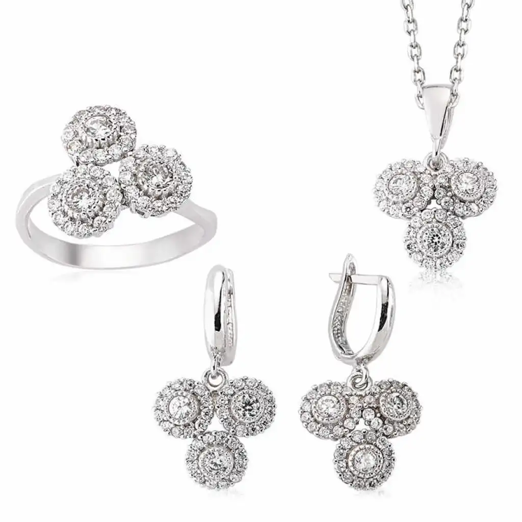 Gümüş zirkon taşlı bayan set güzelliğinize güzellik katıcak. Şık tasarımıyla sevdiklerinize hediye edeceginiz çok özel bir model. Zirkon taşlı bayan set 925 ayar gümüşten imal edilmiştir. Gümüş üzerine rodyum kaplama yapılmıştır. Rodyum kaplama yapılan gümüş bayan set modelleri parlaklığını uzun süre muhafaza eder ve oksitlenmesi gecikir. Set üzerinde bulunan beyaz taşlar zirkondur. Gümüş olan zincir boyu ortalama 45 cm'dir. Bu göz alıcı zirkon taşlı bayan set el emeği ile üretilmiştir. Gümüş ve değerli taşlar nedeniyle belirtilen ürün ağırlığında ± %10 sapma olabilmektedir.