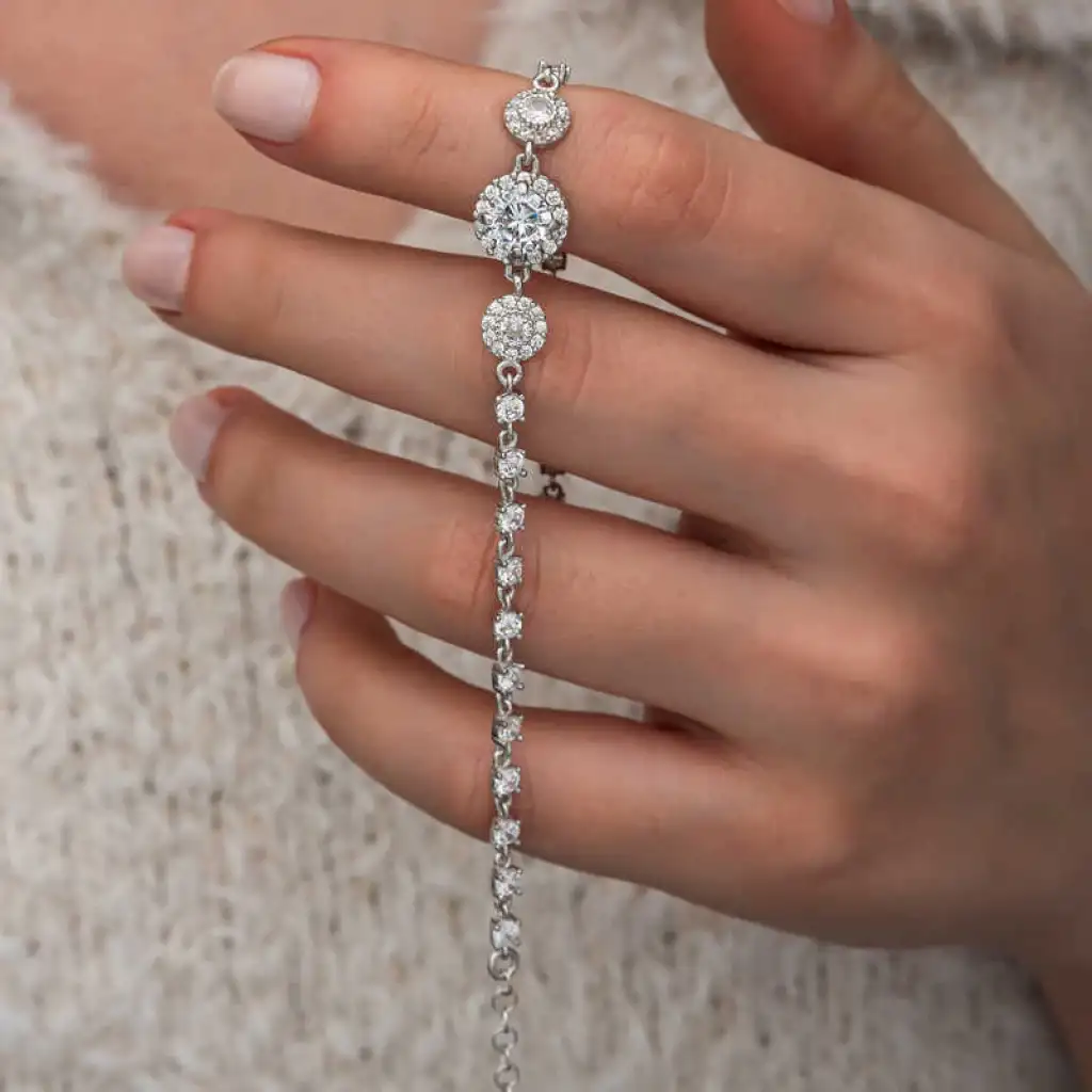 Gümüş üzerindeki zirkon taşlı taştan oluşan bu kadın bileklik modeli günün her anında kullanabileceğiniz şık bir aksesuardır.Bu bilekliği;kendinize ya da sevdiklerinize doğum gününde, Anneler gününde ya da özel günlerde hediye edebilirsiniz.Zirkon taşlı yuvarlak kadın modeli 925 ayar gümüşten imal edilmiştir.Gümüş üzerine rodyum kaplama yapılmıştır.Rodyum kaplama yapılan gümüş kadın bileklik modelleri parlaklığını uzun süre muhafaza eder.Tüm kadın bilekliklerde olduğu gibi gümüş yuvarlak kadın bileklik modeli de el emeği ile üretilmiştir.Gümüş ve değerli taşlar nedeniyle belirtilen ortalama ürün ağırlığında ± %10 sapma olabilmektedir