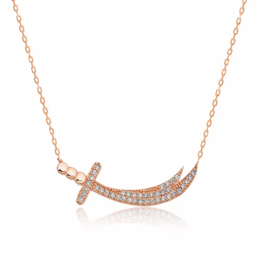 Tarihçilere göre Mısır Melik'i Mukavkas bu kılıcı Hz. Muhammed'e hediye etmiştir. Amrû bin Adûd, savaşta kendisine karşı çıkacak bir savaşçı istediğinde Peygamber, Ali'ye bu kılıcı uzatarak onun karşısına çıkmasına izin vermiştir. Hz. Ali'nin Uhud savaşında Kureyş’in önde gelen savaşçılarından dokuz kişiyi öldürdüğü, bu savaşta bedeninden yetmiş yara alarak son ana kadar Hz. Muhammed'i savunduğu, bu sebeple de Cebrail'in, “Zülfikar'dan keskin kılıç, Ali’den büyük yiğit yoktur.” "Lâ fetâ illâ Ali, lâ seyfe illâ Zülfikâr" dediği rivayet edilir. Ali'nin vasiyeti üzerine Necef'te denize atıldığı belirtilmiştir. Zülfikar kılıcı bayan kolye modeli 925 ayar gümüşten imal edilmiştir. Gümüş üzerine rose altın kaplama yapılmıştır. Rose altın kaplama yapılan gümüş bayan kolye modelleri parlaklığını uzun süre muhafaza eder. Ürünlerimizin tamamında olduğu gibi gümüş zülfikar kılıcı bayan kolye modeli de el emeği ile üretilmiştir. Gümüş ve değerli taşlar nedeniyle beliritlen ortalama ürün ağırlığında ± %10 sapma olabilmektedir.