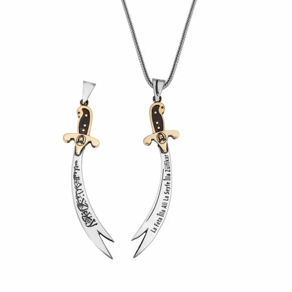 Hz. Ali Uhud savaşında çokca kahramanlık göstermiştir. Savaşta Peygamber Efendimizi korumak isterken kılıcı kırılır.Bunu gören Peygamber Efendimiz kendi kılıcı olan Zülfikar’ı kendisine vermiştir. Kılıcın keskinliği ile diğer kılıçları ortadan ikiye ayırmış ve savaşlarda destanlar yazdırmıştır. Hz. Ali Zülfikar kılıcıyla beraber savaşlardadır artık... Hz.Alinin vefatından sonra kılıcın cennete götürüldüğü biliniyor. Bir başka rivayete göre ise Dicle ve Fırat nehirlerinin arasında olduğu biliniyor. İslam ordularına hükmedecek kişi o kılıcın sahibi olup orduların başkomutanı olacaktır. Bu şık kolye; doğum günü hediyesi, sevgililer günü hediyesi veya hediye olarak özel günlerde tercih edebilirsiniz. Kolye 925 ayar gümüşten imal edilmiştir. Gümüş üzerine oksit kaplama yapılmıştır. Oksit kaplama yapılan gümüş kolye modelleri otantik bir görünüme kavuşur, kararması gecikir. Tüm kolye modellerinde olduğu gibi gümüş zülfikar kılıcı kolye modeli de tamamen el emeği ile üretilmiştir. Gümüş ve değerli taşlar nedeniyle belirtilen ortalama ürün ağırlığında ± %10 sapma olabilmektedir.