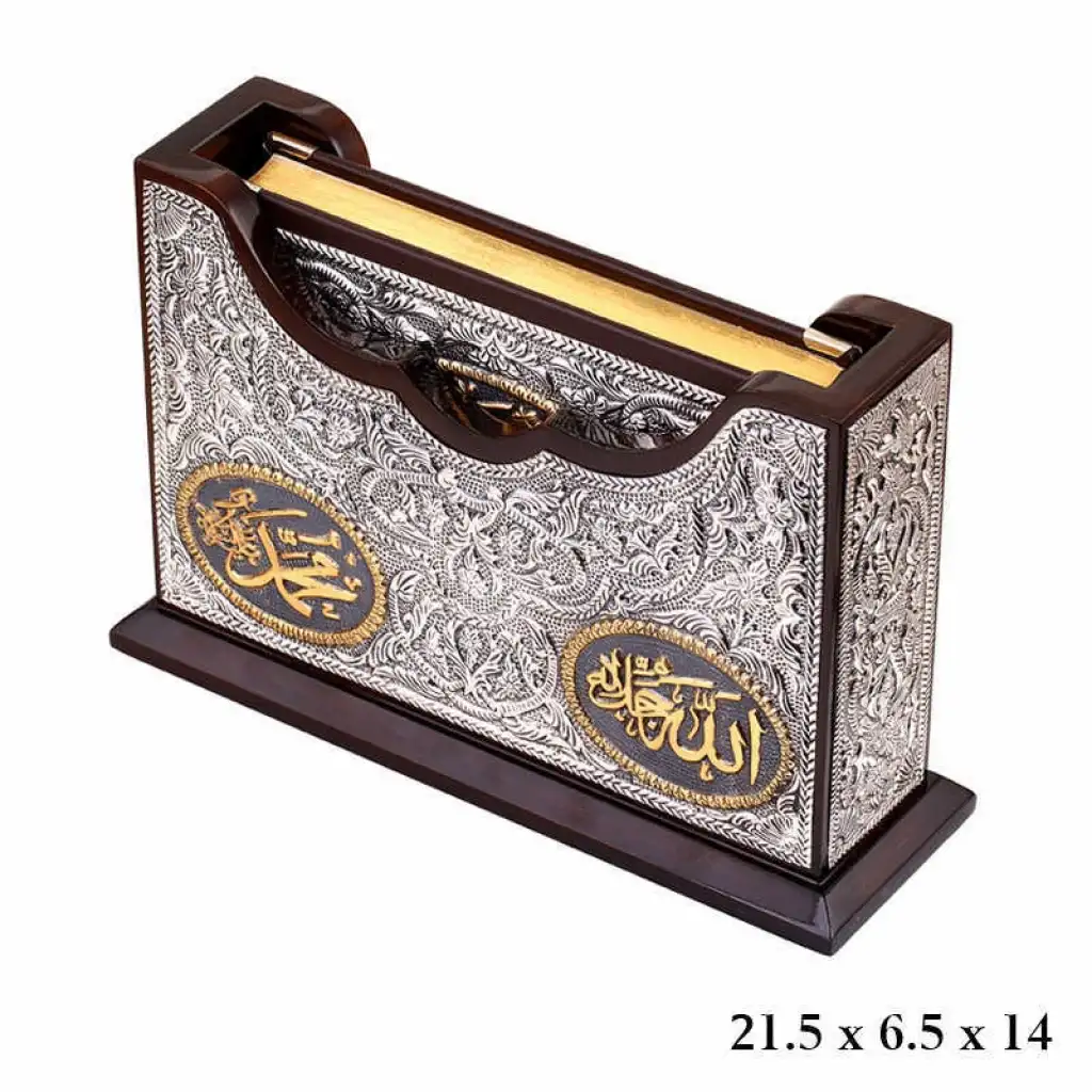 Bu ürün Kur'an-ı Kerim ve kabı olmak üzere iki parçadan oluşmaktadır. Hem evinize, hem sevdiklerinize manevi değeri yüksek çok özel bir hediye seçeneğidir. Kur'an-ı Kerim ve kabı ceviz rengi ahşap üzerine 925 ayar gümüş işlemelerle süslenmiştir. Altın rengi olan kısımlar gümüş üzeri altın kaplamadır. Bu şık ve çok özel ürün tamamen el emeği ile üretilmiştir.