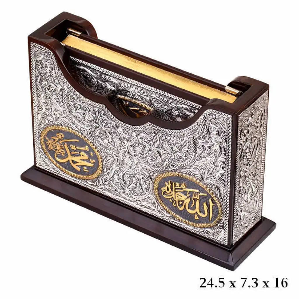 Bu ürün Kur'an-ı Kerim ve kabı olmak üzere iki parçadan oluşmaktadır. Hem evinize, hem sevdiklerinize manevi değeri yüksek çok özel bir hediye seçeneğidir. Kur'an-ı Kerim ve kabı ceviz rengi ahşap üzerine 925 ayar gümüş işlemelerle süslenmiştir. Altın rengi olan kısımlar gümüş üzeri altın kaplamadır. Bu şık ve çok özel ürün tamamen el emeği ile üretilmiştir.