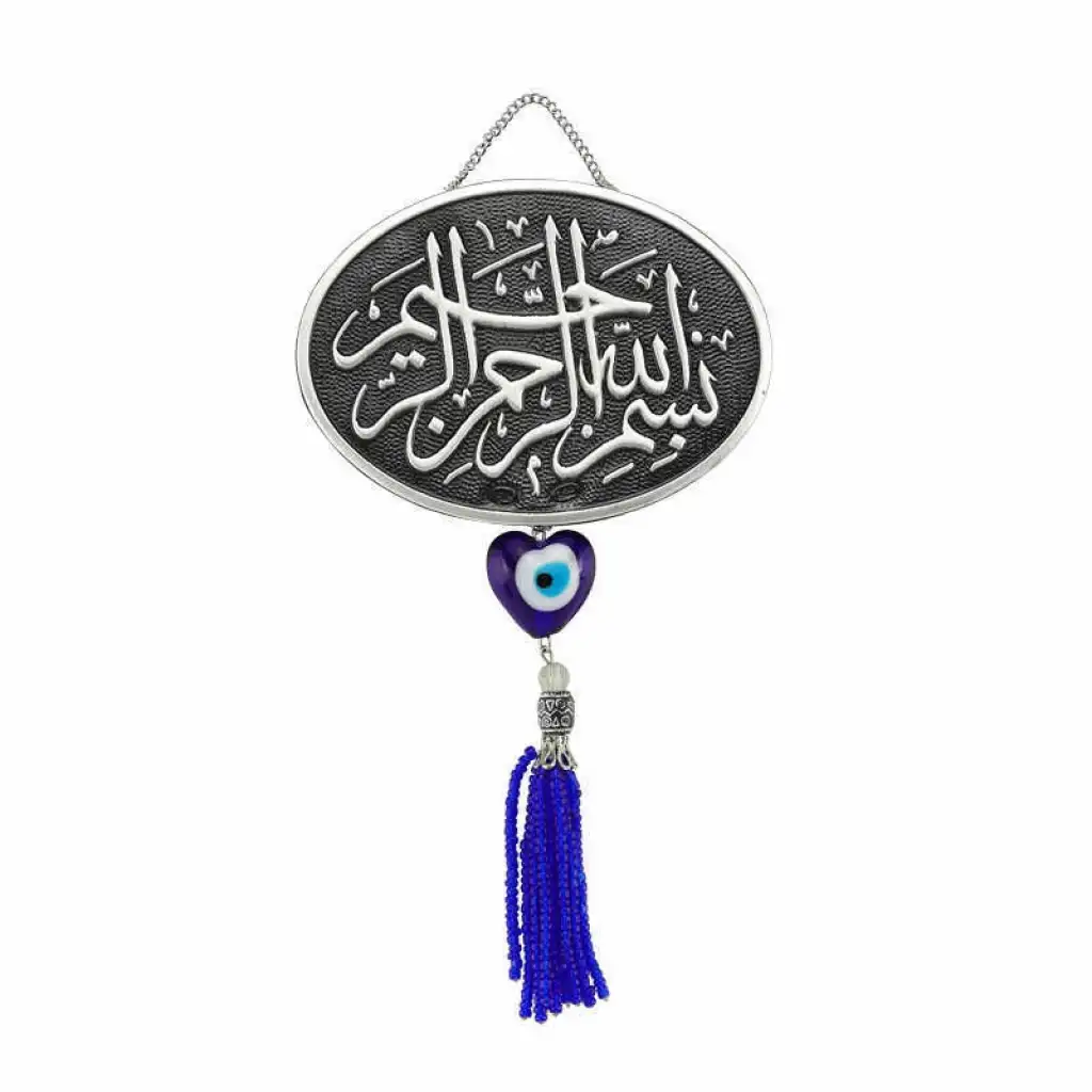 Besmele yazılı nazar boncuklu, püsküllü gümüş ayet ile duvarlarınızı süsleyin.Hediye etmek sevdiklerinizi sevindrimek için özel bir seçim.nbsp;nbsp;Ürünlerimizin tamamı el emeği ile üretilmiştir ve değerli taşlar nedeniyle ürün ağırlığında ± %5 sapma olabilmektedir.nbsp;